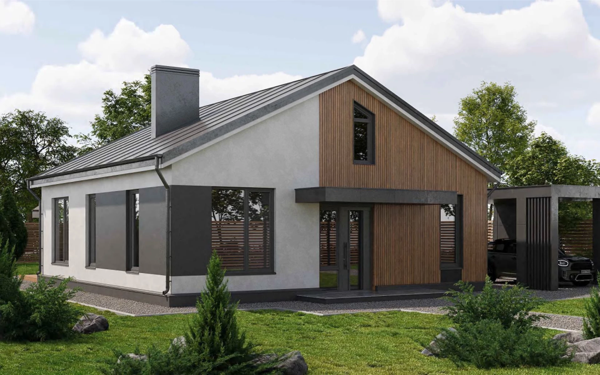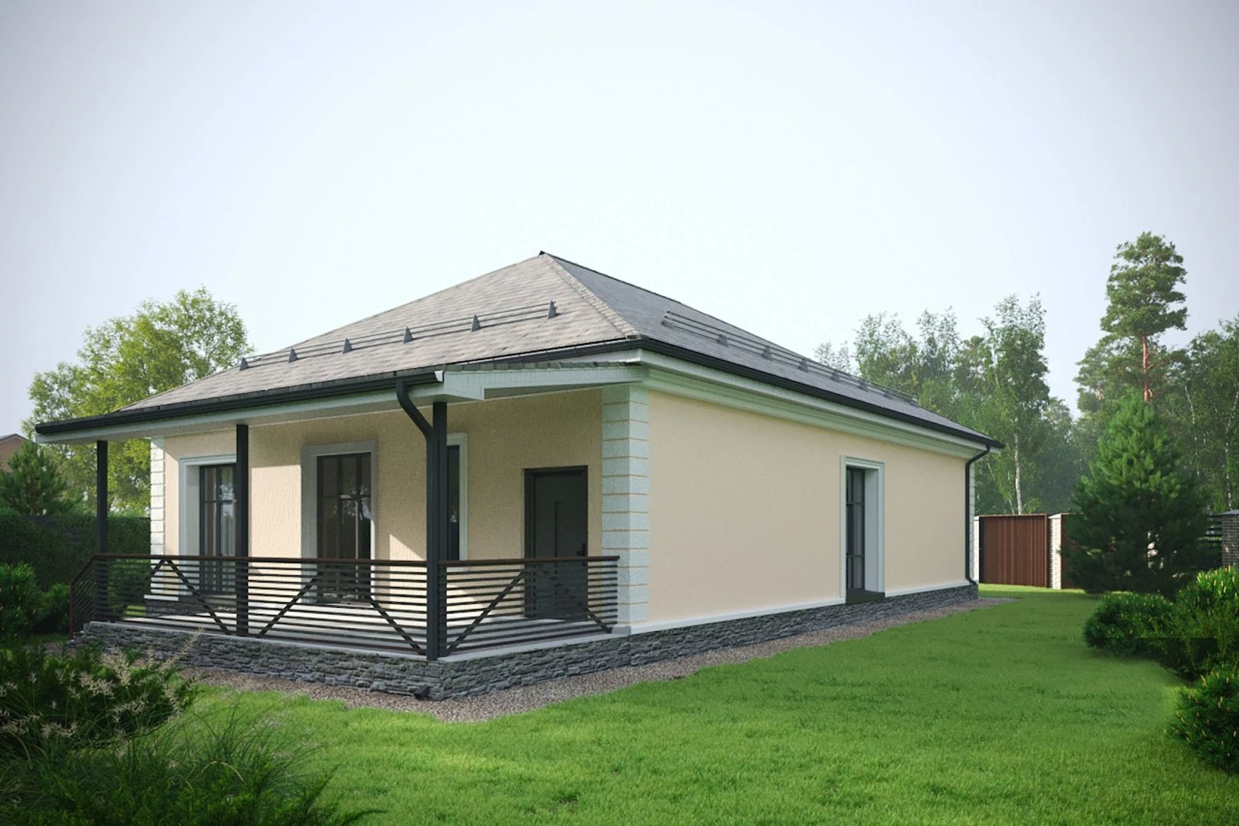 План трёхкомнатного коттеджа со скатной крышей