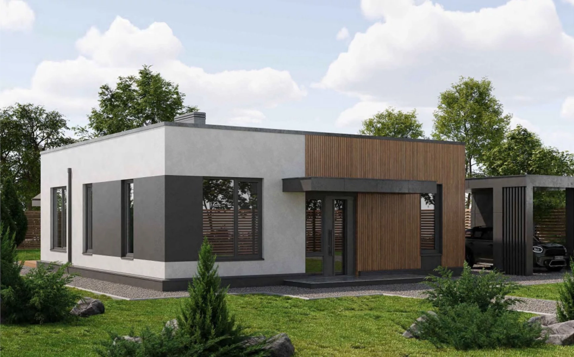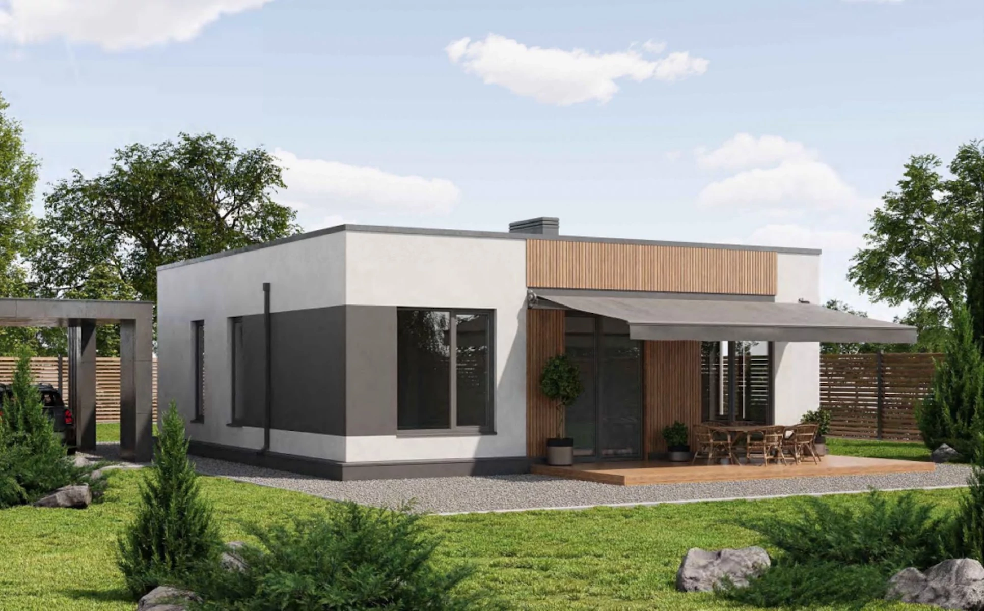План трёхкомнатного коттеджа с плоской крышей