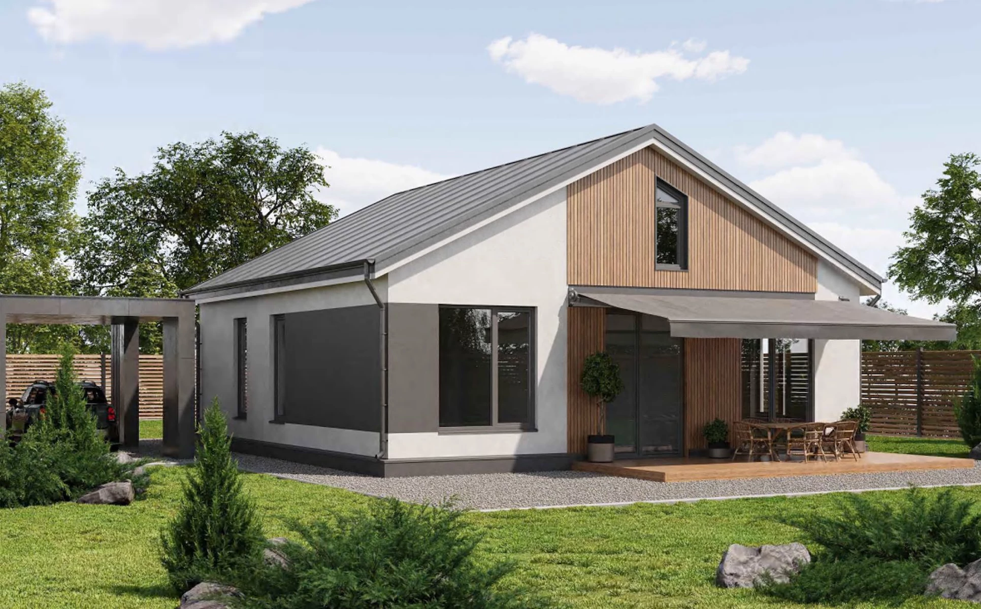 План четырёхкомнатного дома с террасой